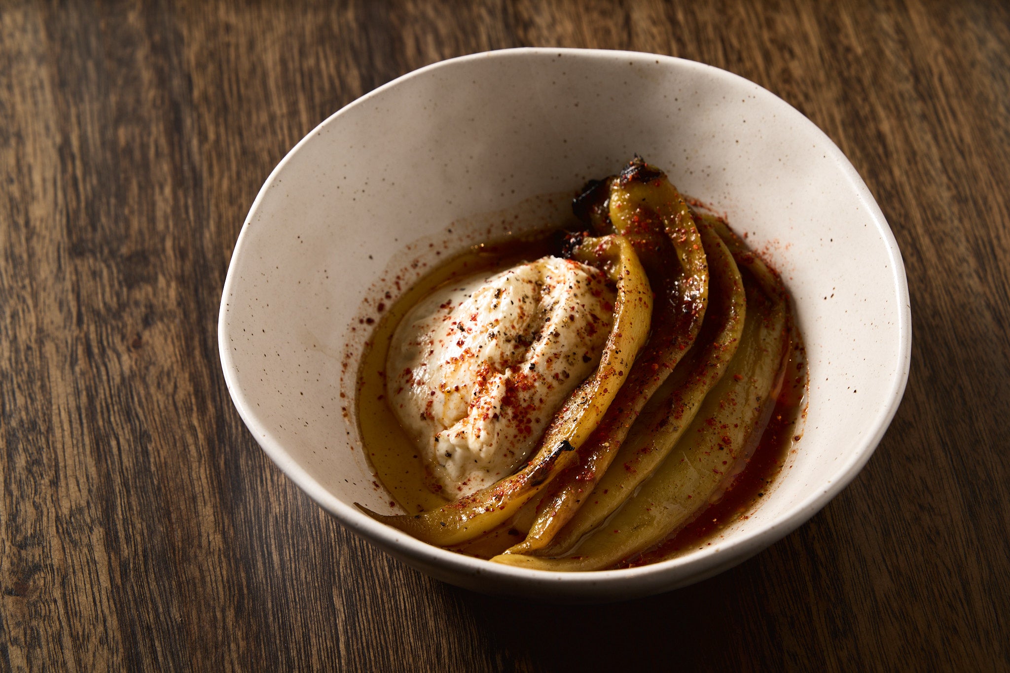 - Grilled banana peppers, Wood Side goats curd, espelette